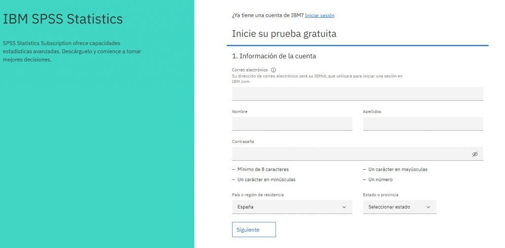 Rellena los datos personales que te solicita IBM para poder acceder a la descarga de este software estadístico avanzado.