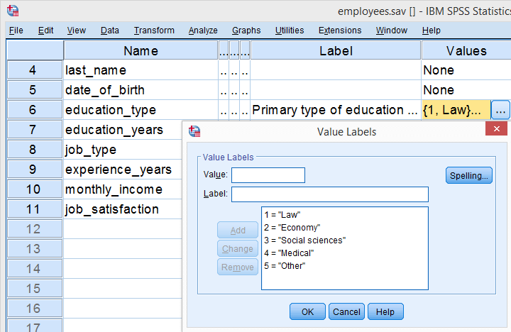 Sin embargo, este no es siempre el caso: las categorías de respuesta para variables categóricas a menudo se representan mediante números, generalmente del 1 al x. Lo que representan estos valores se almacena en su etiquetas de valor. Al hacer clic en el icono de abrir etiquetas de valor ![]()